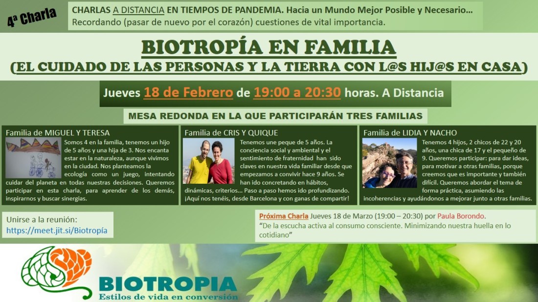 Todavía con el recuerdo de la última charla de Cristina Rois sobre «Necesidad de un nuevo modelo energético», anunciamos la próxima: «Biotropía en Familia. El cuidado de las personas y de la tierra con l@s hij@s en casa». Será el jueves 18 de febrero de 19.00 a 20.30 h. y constará de una mesa redonda en la que tres familias nos hablarán de sus dificultades y alegrías, su trayectoria y camino por recorrer en el cuidado de la tierra y las personas con sus hij@s en casa.
