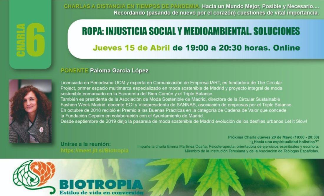 Tras la última sobre «De la escucha activa al consumo consciente. Minimizando nuestra huella en lo cotidiano» a cargo de Paula Borondo, anunciamos la siguiente charla online el jueves 15 de abril de 19.00 a 20.30 h., sobre «Ropa, injusticia social y medioambiental. Soluciones» a cargo de Paloma García López, fundadora de «The Circular Project» y presidenta de la Asociación de Moda Sostenible de Madrid.