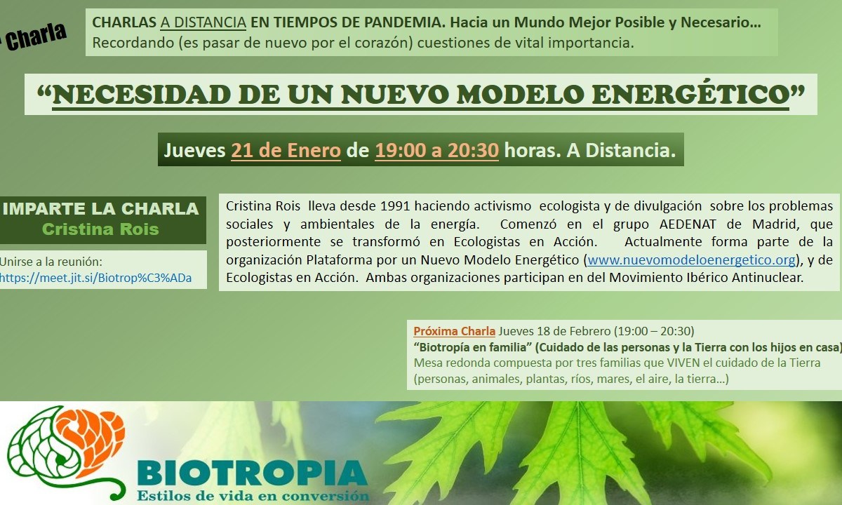Después de las charlas anteriores, "Vivir sin plásticos en tiempos de pandemia" y "Alimentación y justicia social" (ya está disponible en el canal de YouTube "El poder del comensal"), la siguiente tratará sobre "Necesidad de un nuevo modelo energético", a cargo de Cristina Rois (inicialmente se había anunciado a cargo de Cote Romero), el jueves ...