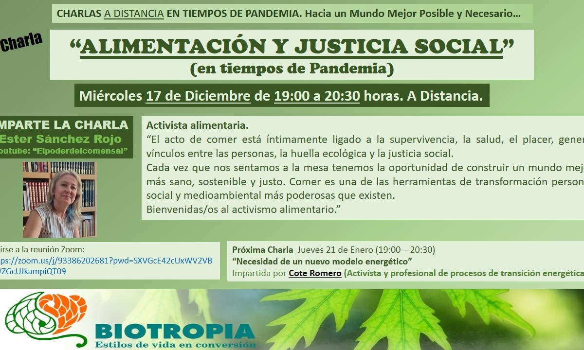 Continuando con las charlas iniciadas el día 18 de noviembre para seguir despertando conciencias que nos lleven a cambios en nuestros estilos de vida hacia vidas cada vez más respetuosas con el medio ambiente y las personas, os invitamos el Jueves 17 de Diciembre de 19:00 a 20:30 horas a la segunda charla: "Alimentación y ...